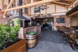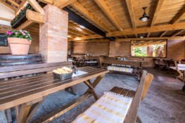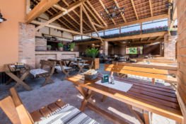 Kompletně zastřešená terasa pojme až 140 hostů. Vaše děti určitě ocení, že budou mít k dispozici dětský koutek. Je zde možnost rožnění selat, vepřových uzených kýt, uzení a grilování na venkovním prostorovém grilu.
